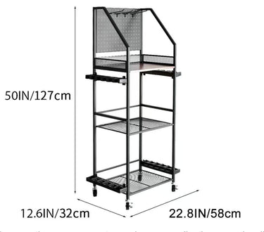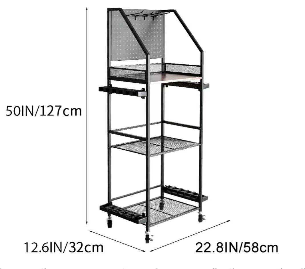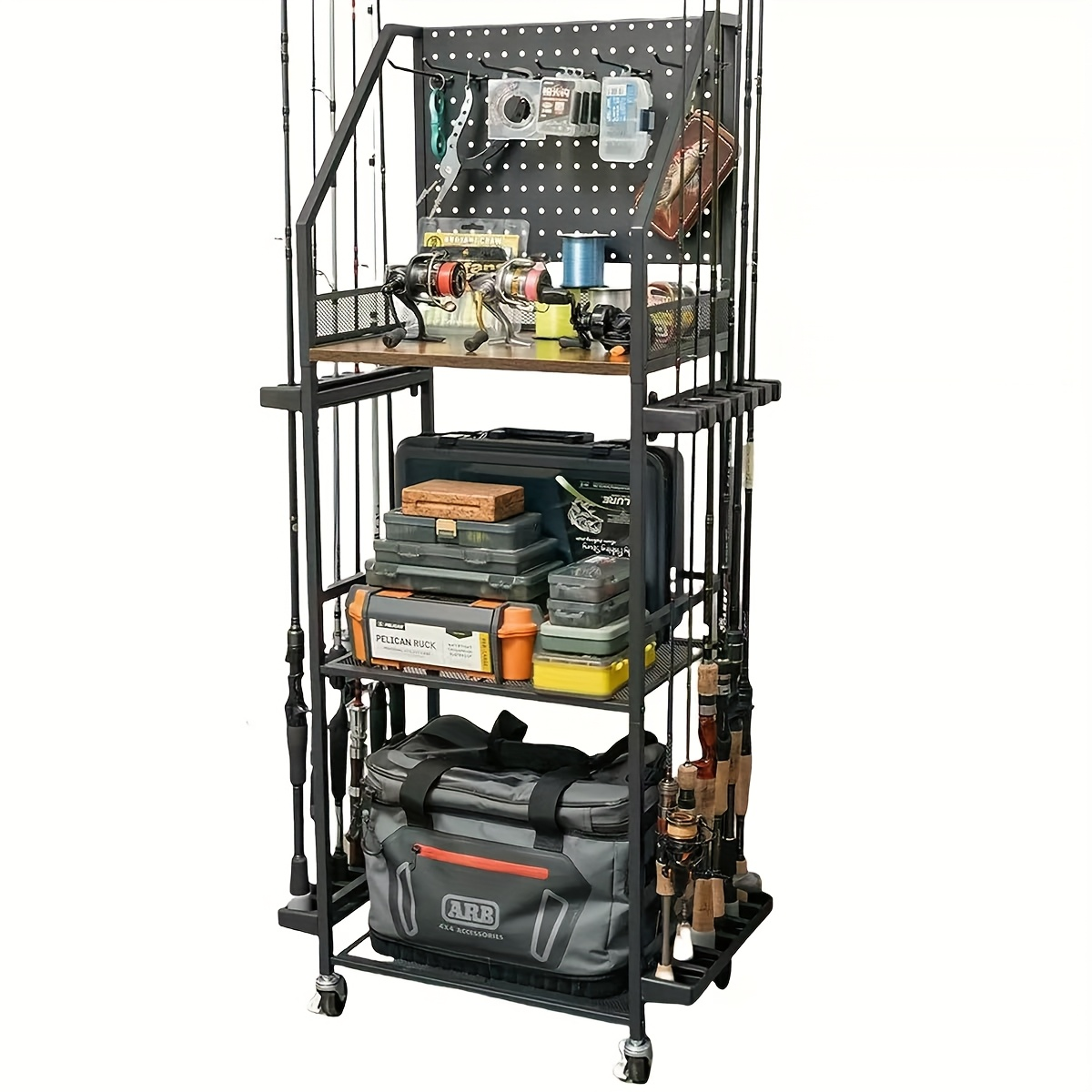 Customizable Pegboard & Hooks: The top tier of the rod rack is equipped with a pegboard featuring 6 hooks, allowing you to customize the storage space according to your needs. Whether you need to hang lures, bait, sun protection tools, fishing gloves, or other accessories, the pegboard system offers versatile storage options to keep all items within reach and neatly arranged.