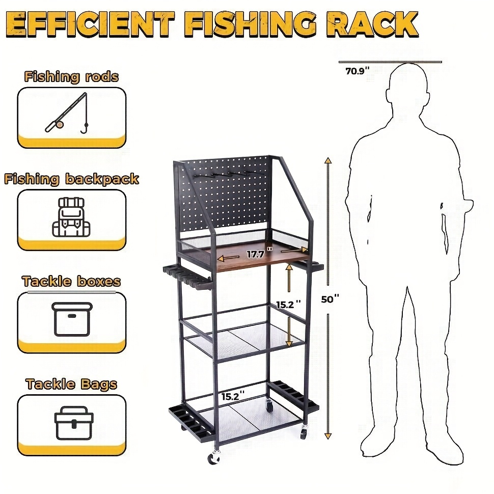 Spacious 3-Tier Storage Capacity: The 3-tier movable fishing rod rack offers ample storage space with three large shelves. Each tier features protective rails on three sides, ensuring your fishing gear stays safe and organized. Perfect for storing tackle boxes, lures, reels, and other essentials—an ideal Christmas or Father’s Day fishing gift for men.