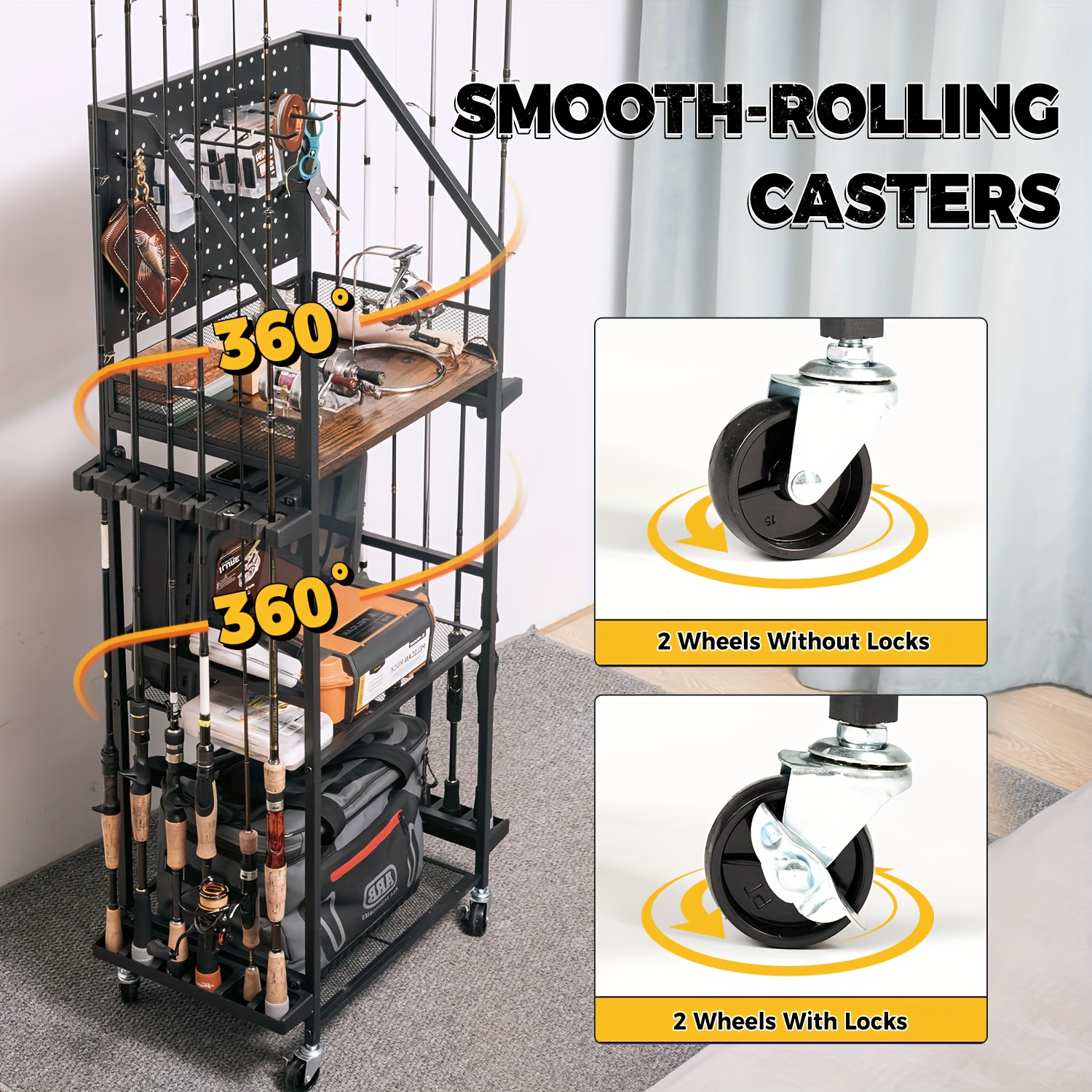 360° Quiet Brake Casters: The fishing gear rack is fitted with 4 360-degree quiet casters (2 with brakes) at the base. This feature enables easy movement and positioning, keeping the rack securely in place when needed. Whether in the garage, shed, or by the lake, this mobile rack delivers unparalleled convenience and versatility to meet all your fishing needs.