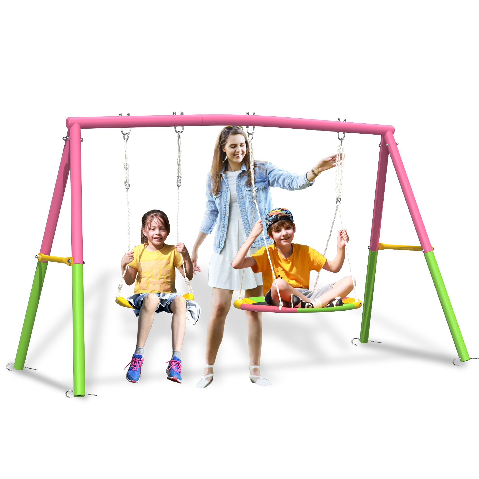 - 【Double Swings for Double Fun】 The Swing Stand with 81 cm Saucer Swing and 66.5 cm Swing Seat is a perfect swing sets for backyard. Kids or adults can swing happily together in your backyard, playground and more indoor/ outdoor places.