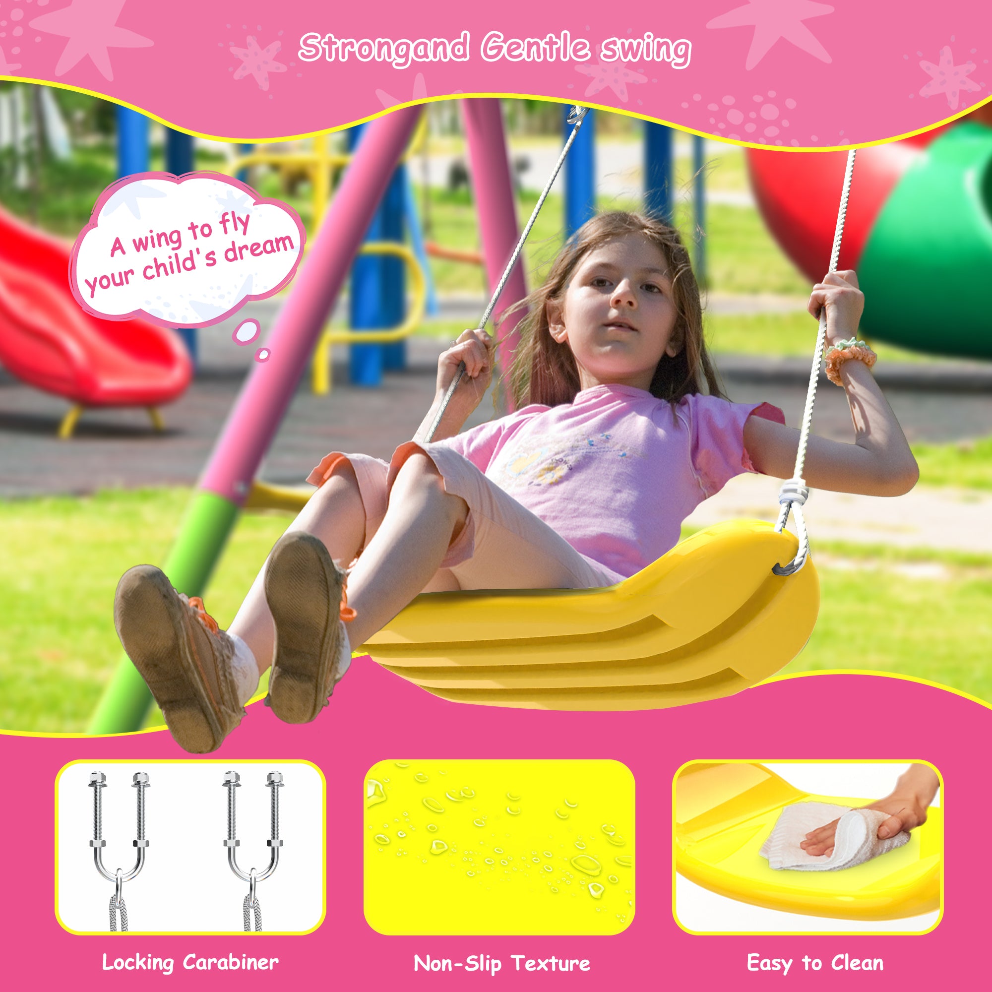 - 【Easy to Install and Adjust】 This swing set is a great way to relax and is perfect for outdoor play. The carabiner design makes it easier to install and remove the swing seat. The components are pre-drilled for easy assembly.
