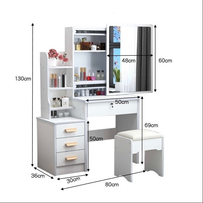 White Vanity Dressing Table Set - Glass Top, Drawers, Shelves, LED Lig